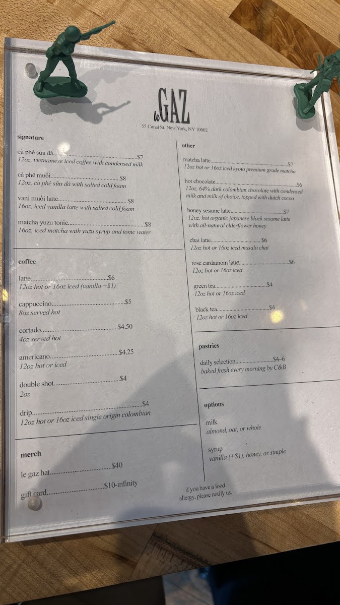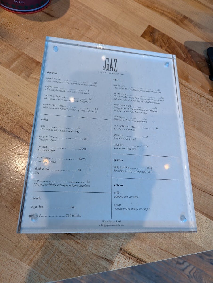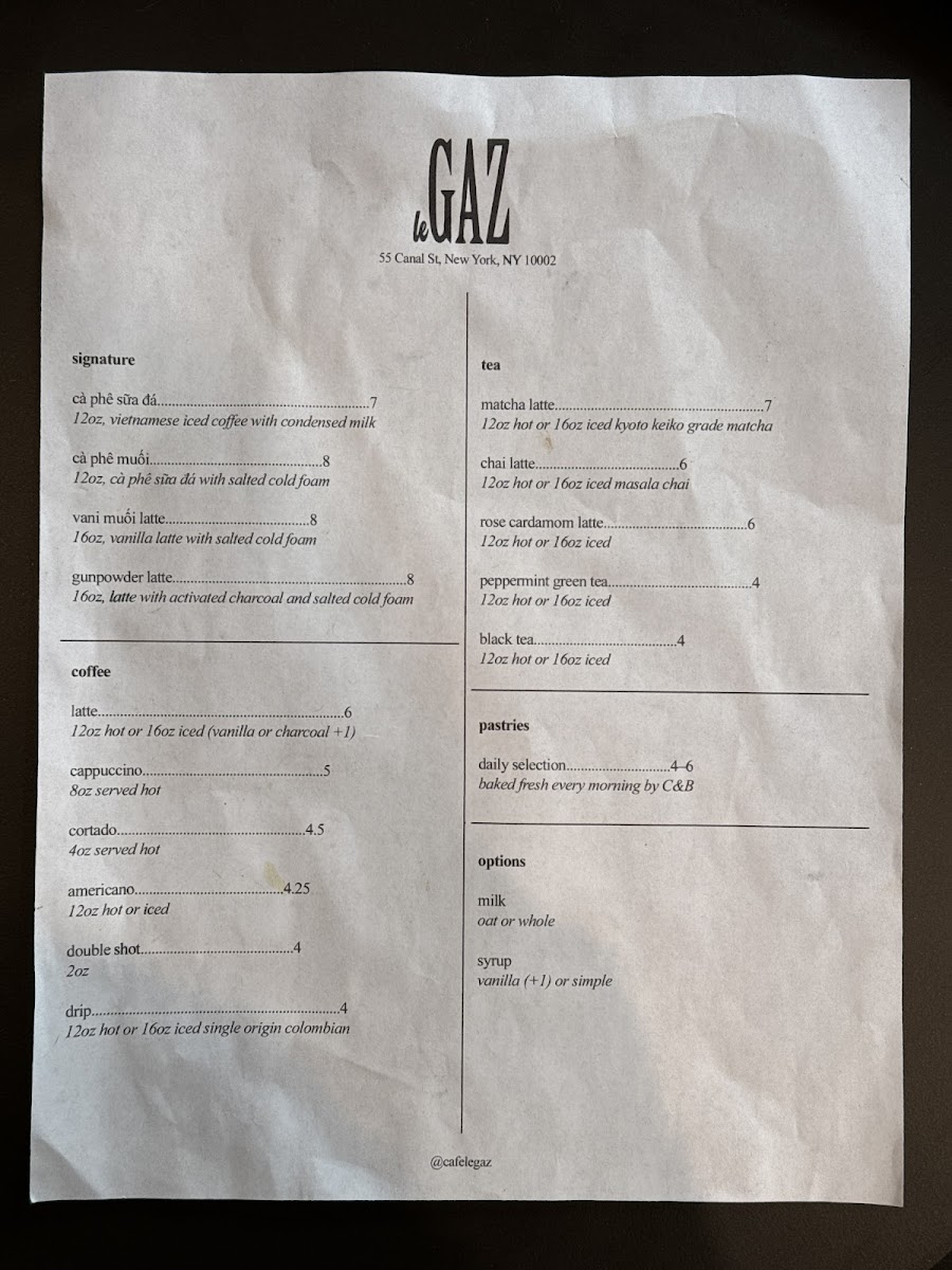 The menu at this café focuses primarily on a variety of coffee and specialty drinks, with options suitable for coffee breaks or casual visits. The offerings include several signature beverages as well as classic coffee and tea selections.